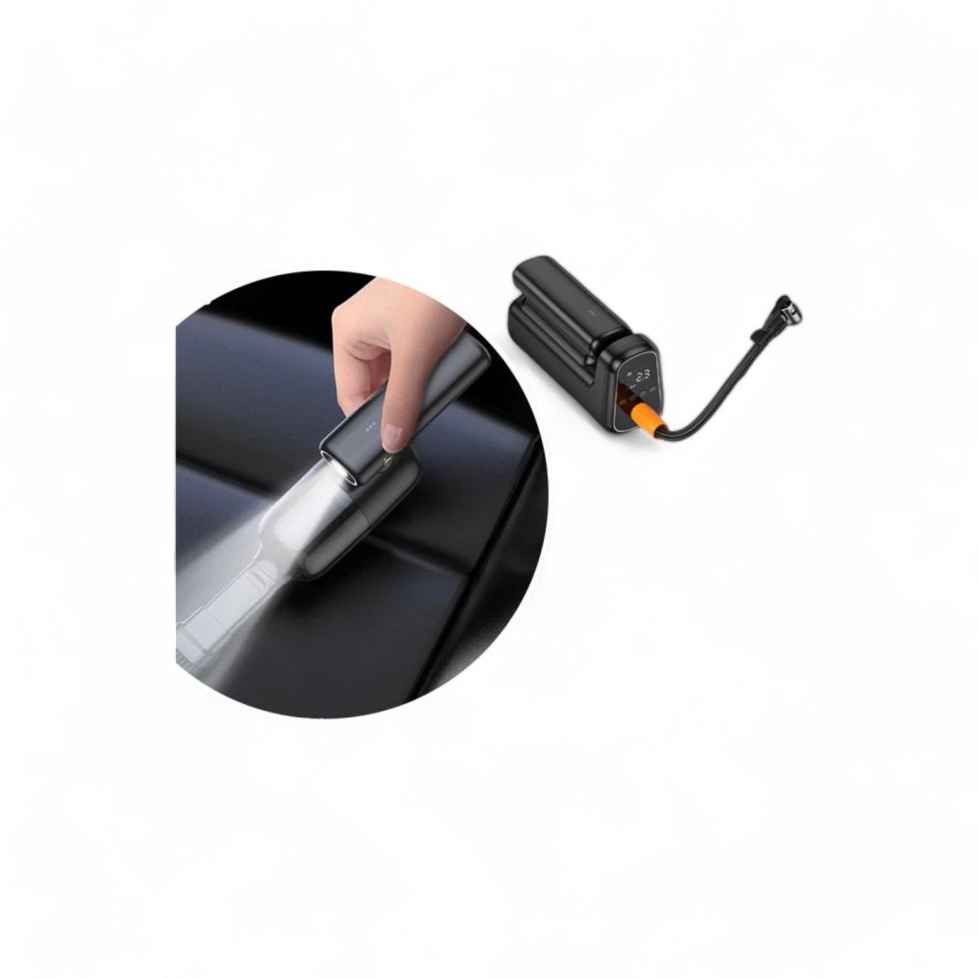مكنسة كهربائية، مضخة هواء لنفخ الإطارات، مصباح يدوي، بنك طاقة ومضخة شفط ينظف السيارات، ينفخ الإطارات، يضيء الأماكن المظلمة، يشحن...