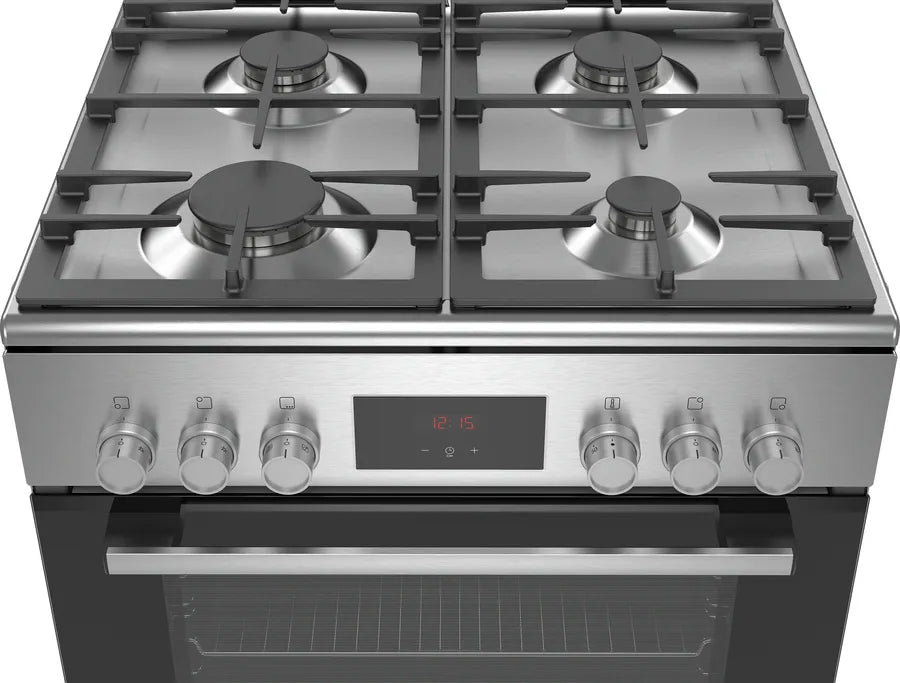 سلسلة بوش 4 طباخ غاز مزدوج قائم بذاته، مصنوع من الفولاذ المقاوم للصدأ ، يجمع بين أفضل ما في العالمين، فهو يجمع بين موقد غاز دقيق وفرن كهربائي متعدد الاستخدامات. يتميز هذا الطباخ بتصميمه المعدني الفضي الأنيق، وسعة فرن واسعة **66 لترًا** وموقد غاز عالي السرعة، مما يجعله مثاليًا للطهي والخبز بمرونة وكفاءة.
