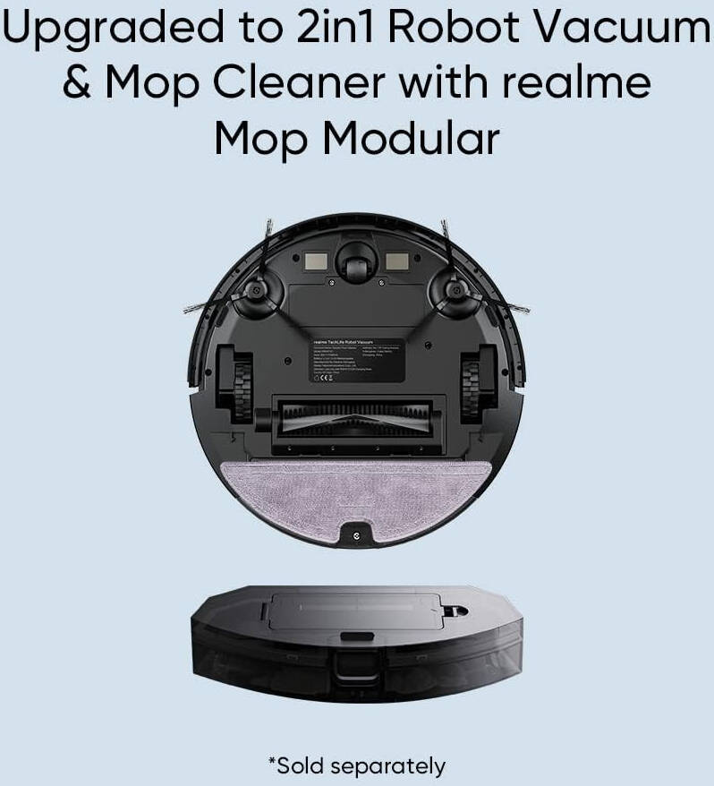 مكنسة كهربائية روبوتية من Realme Techlife، سلة مهملات سعة 0.35 لتر، خزان مياه سعة 0.3 لتر، قوة شفط 3000 باسكال، بطارية ليثيوم أيون 5200 مللي أمبير/ساعة