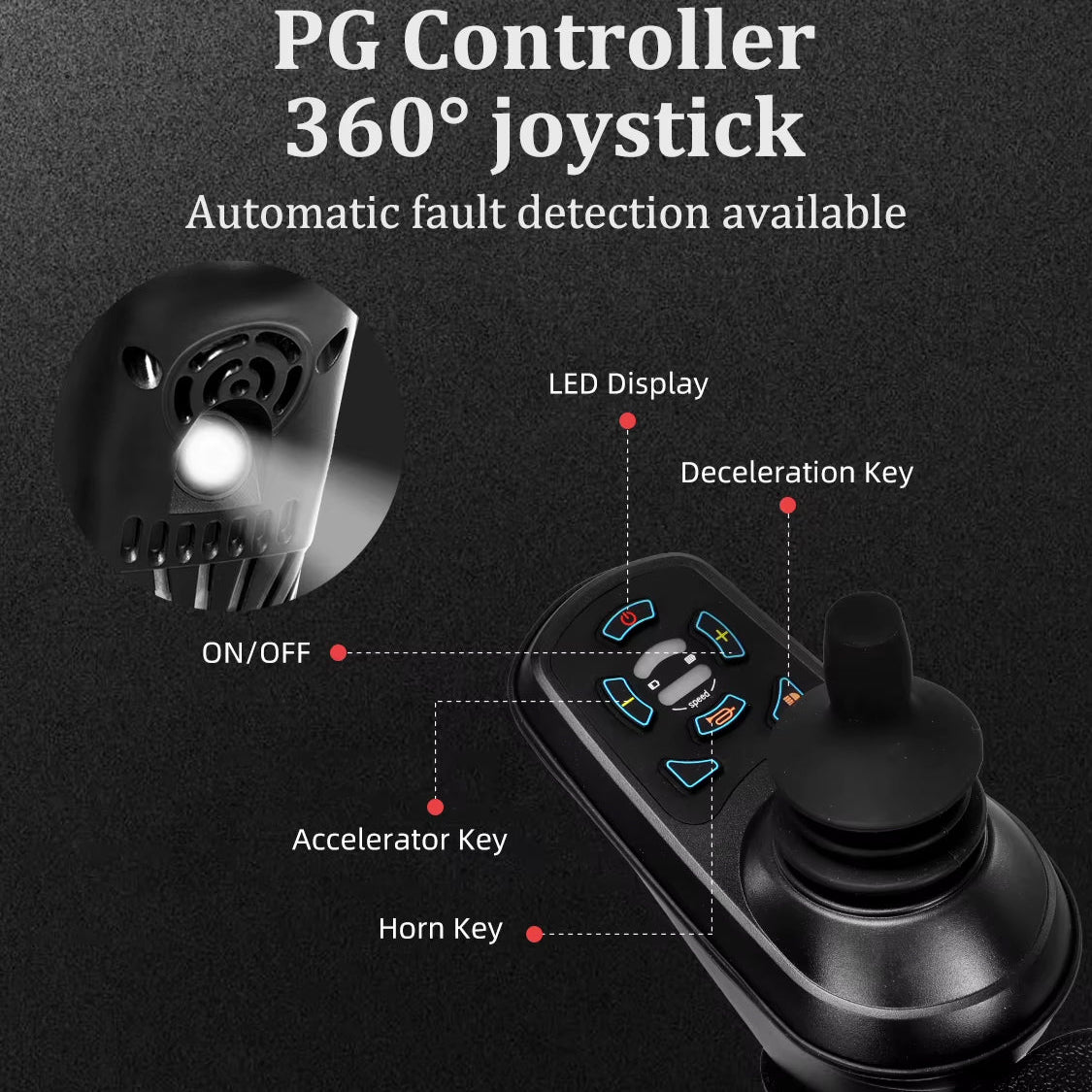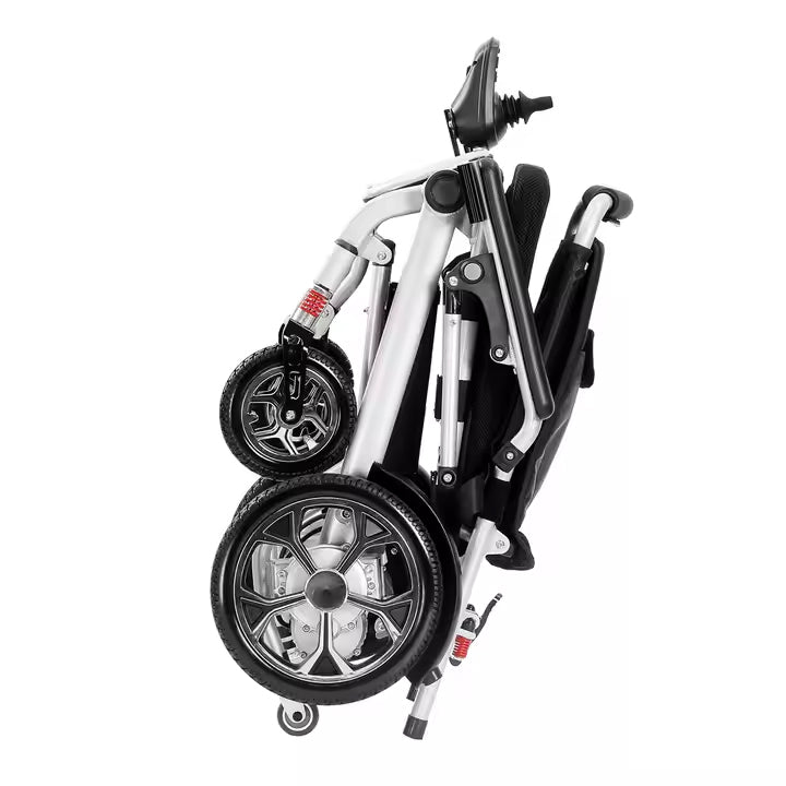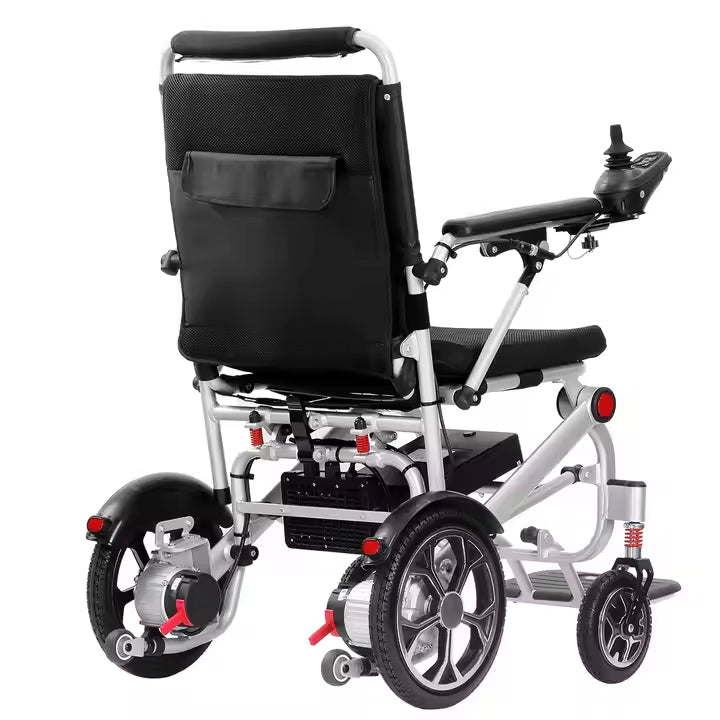 The Lightweight Folding Electric Wheelchair is engineered for maximum convenience and mobility. Built with a durable aluminum alloy frame, it weighs only 17.5 kg yet supports up to 130 kg. Dual 150W motors provide smooth movement across multiple terrains, while its quick-fold design makes it travel-friendly, even for air transport. Comfort is enhanced with a reclining backrest, thick cushions, and liftable armrests.
