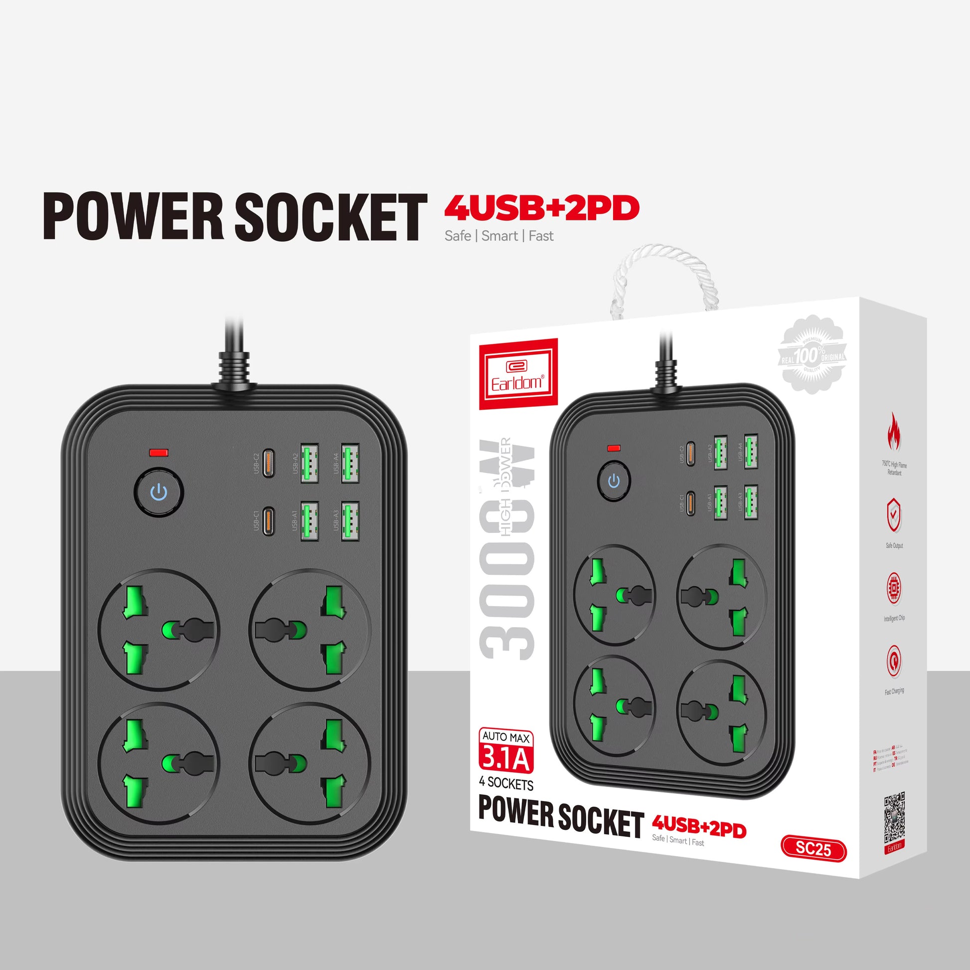 4 universal AC sockets + 4 USB + 2 PD Type-C ports