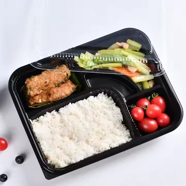 The 5-Compartment Disposable Plastic Food Container is ideal for meal prep, takeaways, and portion control. Featuring five separate sections with a secure lid, it keeps food fresh and organized. Its durable design makes it microwave-safe and easy to stack, ensuring convenient storage and transport for home, office, or commercial use.