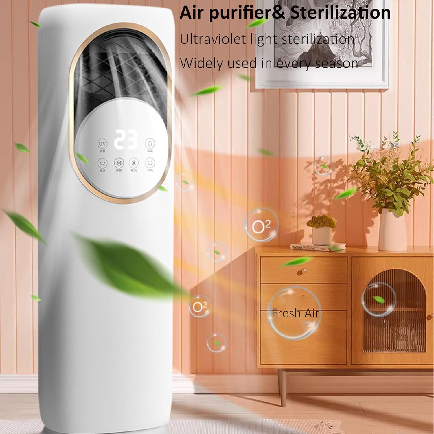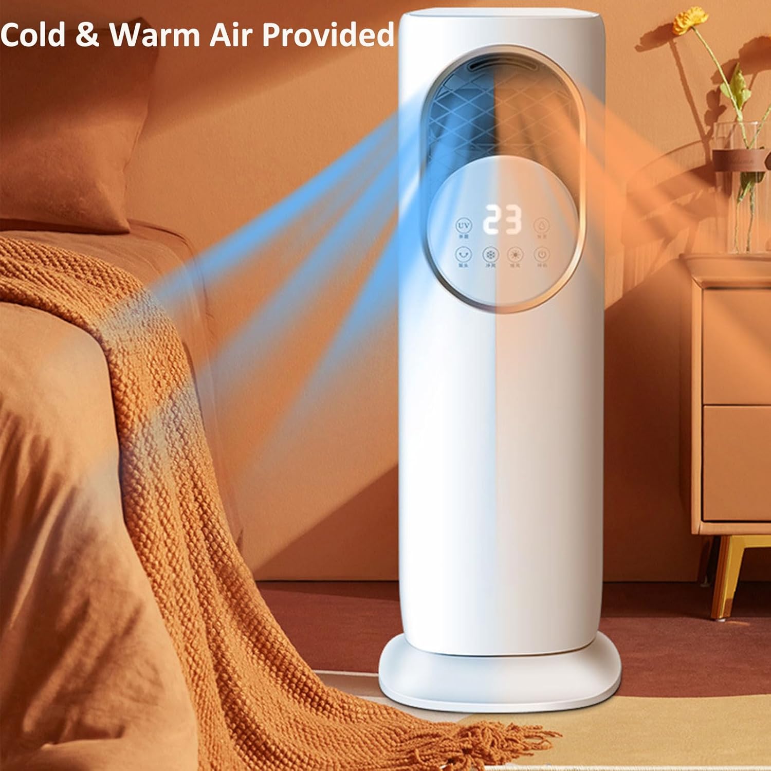 The 5-in-1 Cooling & Heating Tower Fan provides year-round comfort by combining cooling, heating, misting, humidification, and UV sterilization in one appliance. With 1800W heating power and ice crystal cooling, it delivers efficient temperature control. The bladeless design ensures safety, while the LCD touch screen and remote control provide effortless operation for home and office use.