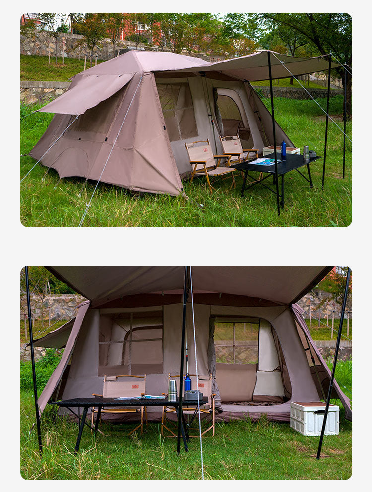 The Chanodug Spacious Portable QuickOpen Camping Tent (6–8 People, 4 × 2.8 × 1.9 m) features a 13 m² interior with two bedrooms and one living room, spring-pressed telescopic automatic bracket for fast setup, 210D encrypted Oxford cloth with PU2000 mm waterproofing and breathable five-veil mesh windows for airflow.