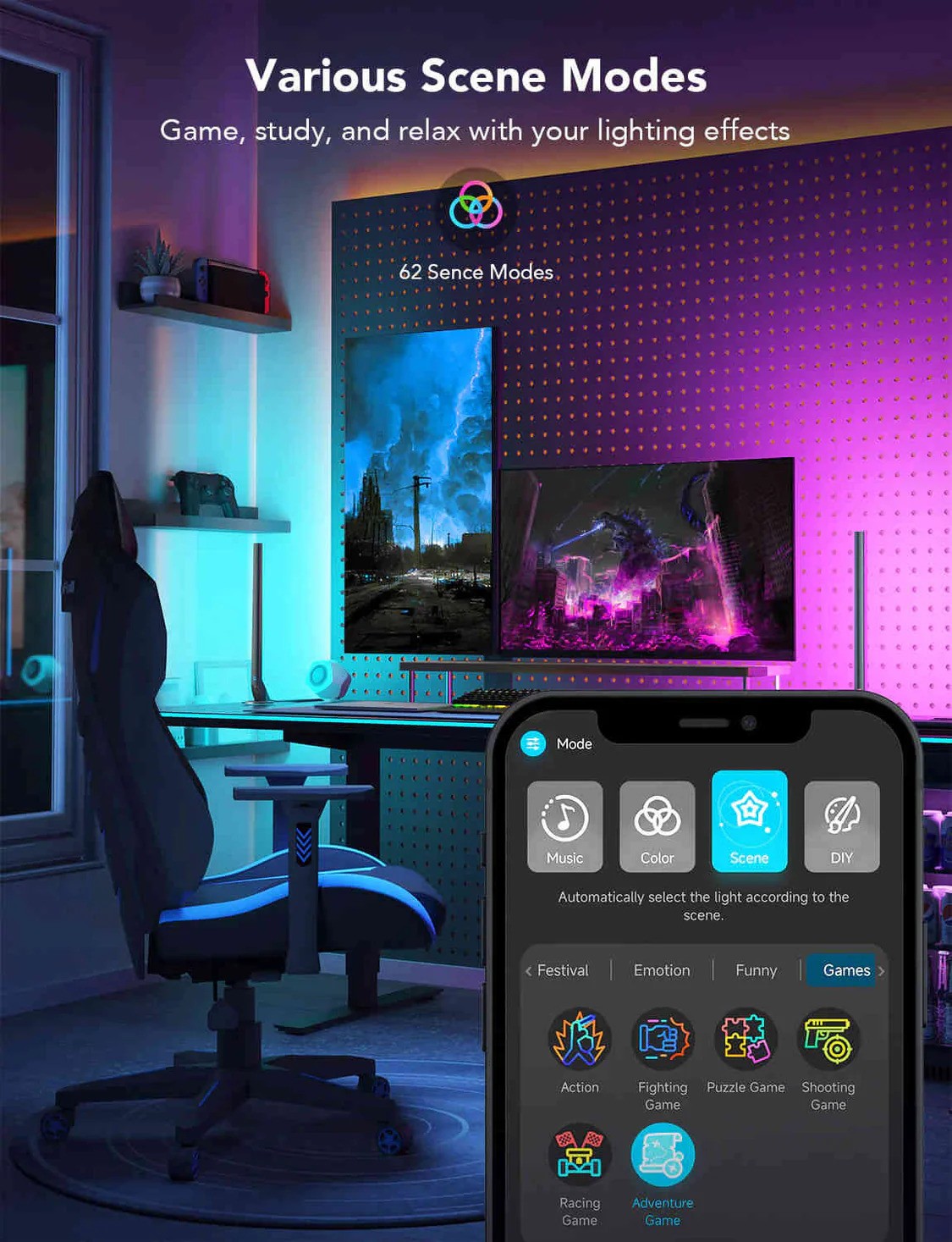 Customizable Scene Modes: Choose from preset lighting effects or create your own for a personalized experience.