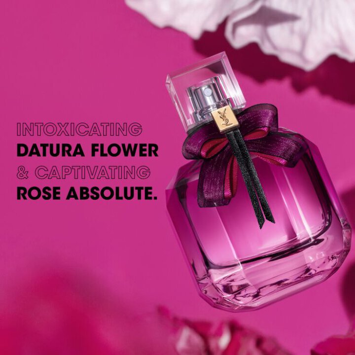 Surrender to the most intense version of the intoxicating scent of MON PARIS. A long-lasting and hypnotic floral fragrance combining precious Centifolia Rose Absolute and Datura Flower accord. Dare to declare “Je t’aime” with MON PARIS INTENSÉMENT. A bold fuchsia lavallière is covered by sheer black organza, a combination of intensity and sensuality. The multifaceted precious bottle lacquered in a gradient luminous fuchsia. A poetic representation of intense and oversized love.